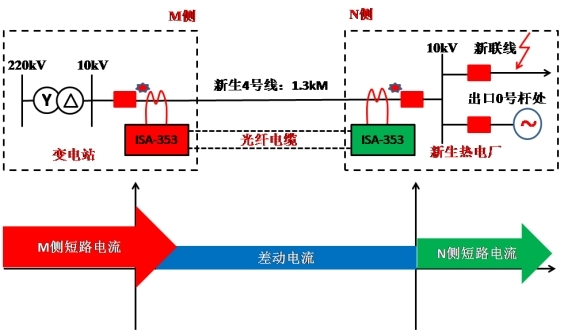 2007年8月5日某220kV變電站10kV重生4號線光纖分相電流差動保護(hù)動作,開關(guān)跳閘,經(jīng)巡線人員檢查、毛病點(diǎn)在新聯(lián)線出口0號桿處保護(hù)人員檢查兩邊保護(hù)裝置,仿照區(qū)內(nèi)外毛病保護(hù)均反應(yīng)正確,如下圖所示,試剖析跳閘緣由。