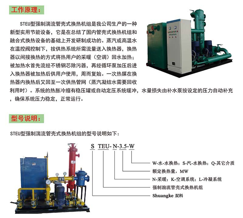 強(qiáng)制湍流管殼式換熱機(jī)組是集管殼式換熱器、循環(huán)水泵、疏水器系統(tǒng)、補(bǔ)水泵、除污器、溫度計(jì)、各種儀表傳感器、管路和閥門及工控為一體的成套換熱控制設(shè)備。利用歐文(OWEN)湍流抖振原理,換熱管采用特殊工藝制成的雙螺紋螺旋槽的結(jié)構(gòu),使熱媒在傳熱過程中充分釋放能量,換熱系數(shù)大大提高。該設(shè)備廣泛應(yīng)用于工業(yè)生產(chǎn)、公共建筑、住宅建筑等的采暖、空調(diào)、制冷、生活熱水及熱電系統(tǒng)的換熱及冷凝。